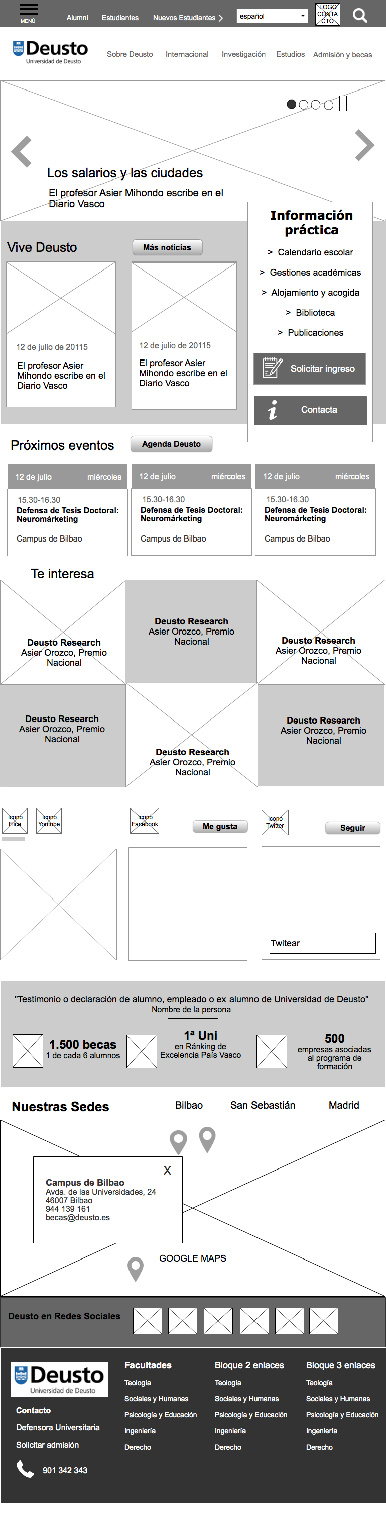 First of all, I try to do a rapid navigational tree and I found six level of navigation… Wow. After hours of thinking in a convenient proposal, we discard the hamburger both desktop and mobile, we decided to prototype only for 468 px and 1.280 px and work hard in the navigational system to make robust the solution instead thinking only in templates without the integration of all the subjects.